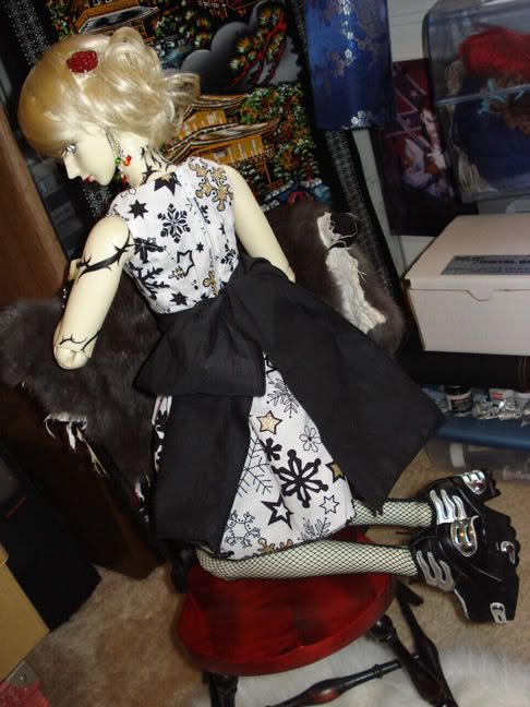 Xerxes crawls up onto the chair, wearing a new dress he had received for christmas,